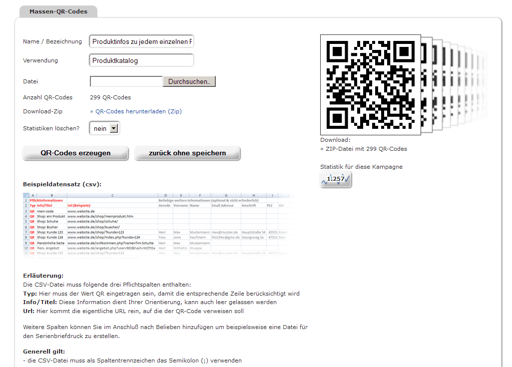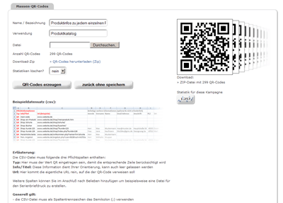 - einfacher CSV-Datei-Upload für dynamische QR-Codes (bis 10.000 Datensätze)